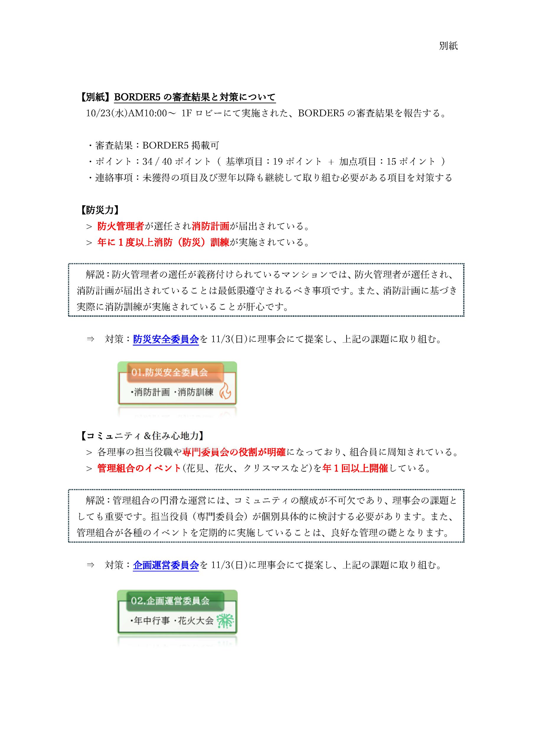 桃井: 理事は監事を含めて10 名です。専⾨委員会を 4 つ設置し、防災安全委員会、企画運営委員会、⻑期修繕委員会(旧:経費最適委員会)、資産運⽤委員会と分けました。これらはBORDER5の評価項⽬にほぼ対応する形です。初期段階では私が委員⻑を兼任し、全体の 8 割を主導し、管理会社の防災訓練サポートや外部業者のイベント運営⽀援を活⽤しました。当初は私が主導しましたが、次第に体制化できました。現在は委員がのべ 14 名まで増え、兼任しながらも各委員会が機能しています。