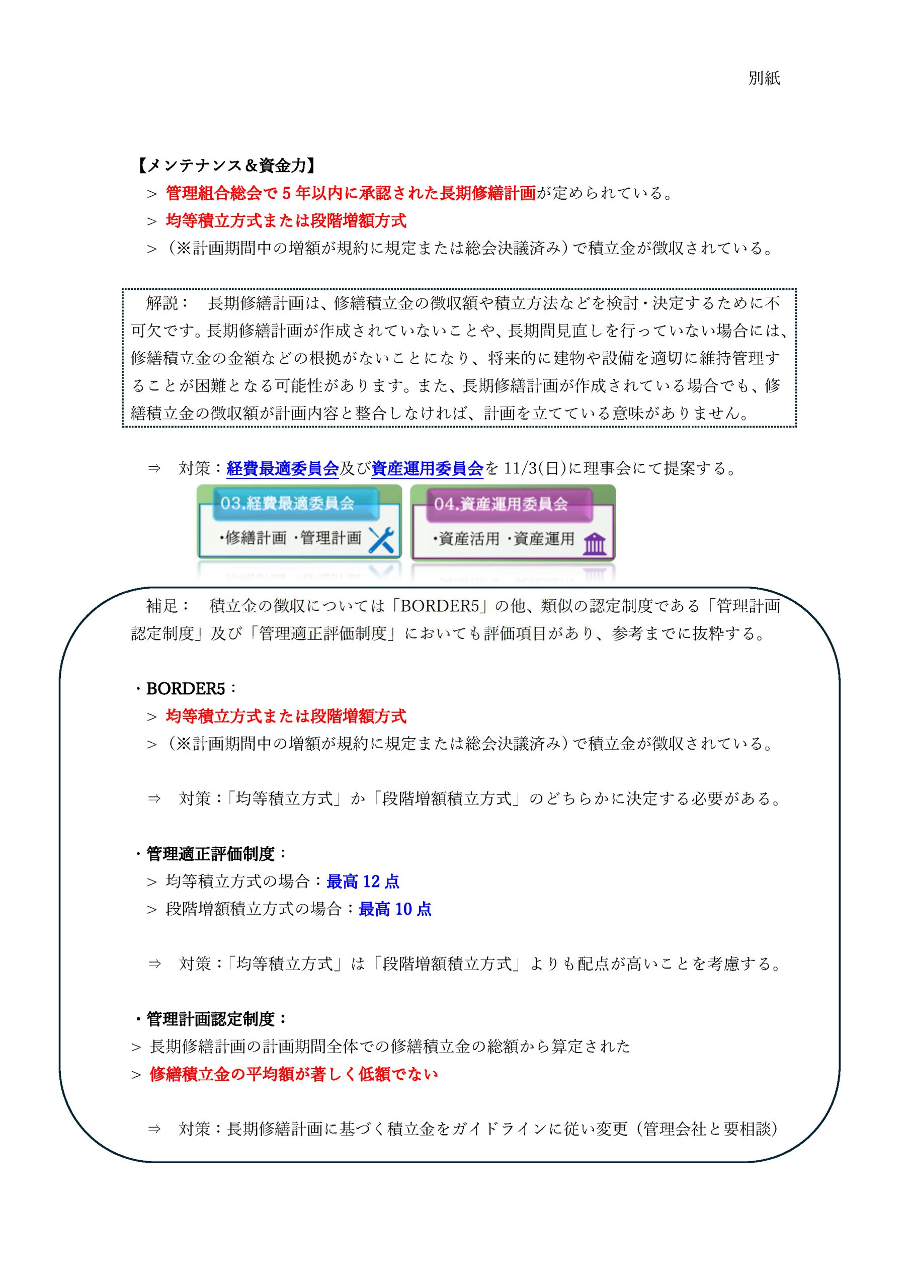 桃井: 2022 年 6 ⽉の理事会で管理計画認定制度の認定に向けて既に取り組んでおり、築4年⽬で私が⼊ったタイミングで管理会社から管理適正評価制度の提案がありました。そこでBORDER5も視野に⼊れ、並⾏して進めました。築浅のため書類が揃っており、早期取得の利点を⽣かせました。