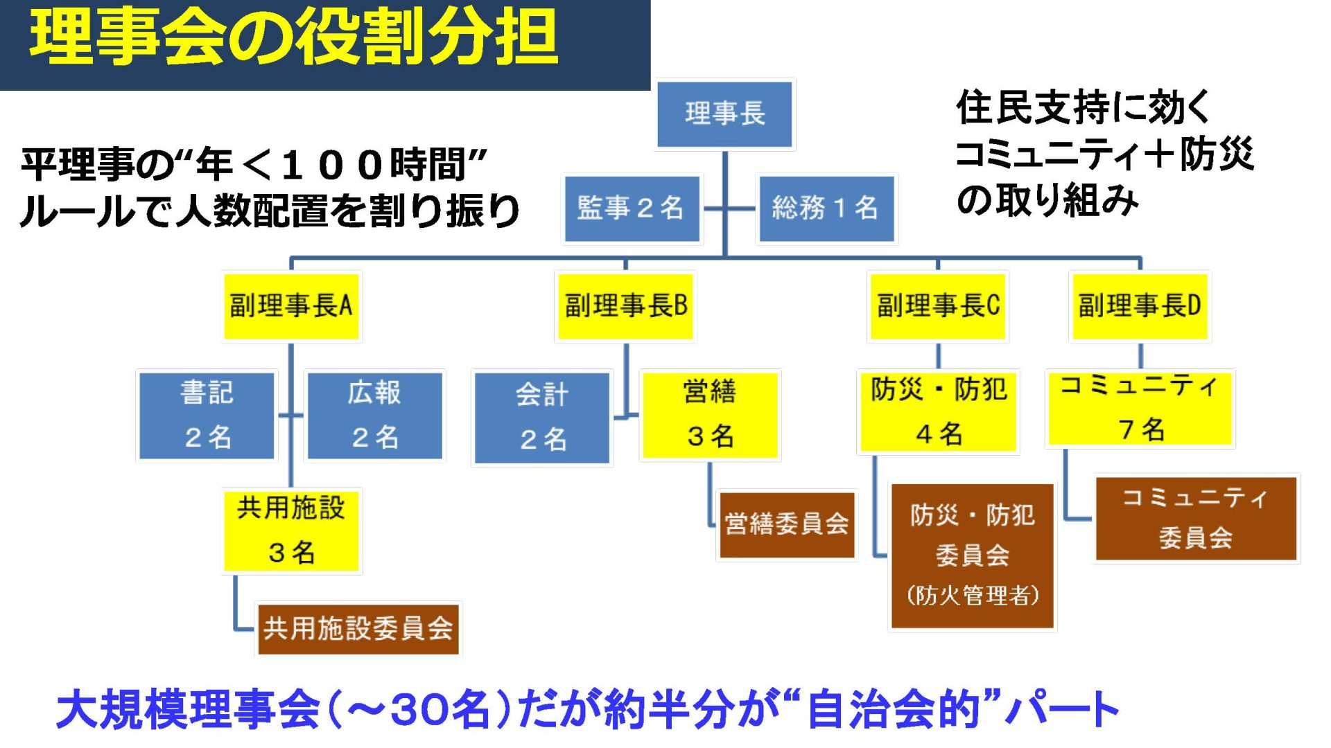 私の組合の役割分担は、例えば自治会が組織を維持困難になって防災とコミュニティの主管から外れて、その時期に自治会役位だった人が映ってきたなどで”とても理事会の人数が多い”実情に合わせて出来上がってきたもので、組合ごとに事情は違うからあくまでもサンプルで無数にある解決策の1つにすぎません。どこもこうしろと言っているわけではないです。
