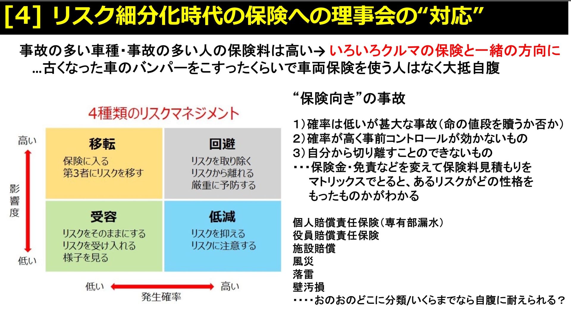 よくあるリスクマネジメントでの、”発生確率”×”影響度”での4分類で見ると、近年保険料ね上げとなっているリスクは”頻繁に起こる”が”高額ではない”ものに圧倒的に偏っているわけです。