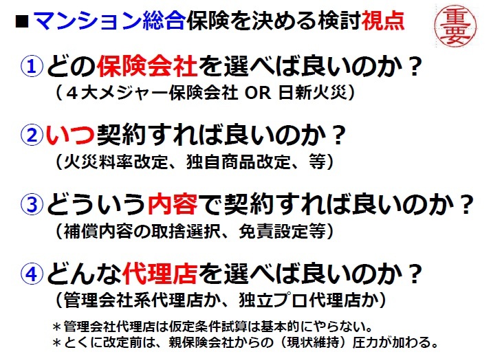 管理組合の保険の設定はとても複雑な上に、保険の代理店の側では、手数料等の収入が基本は保険料に比例することから、そのマンションに合わせた保険金額や、具体的な補償内容をきめ細かく提案する動機付けが弱いです。