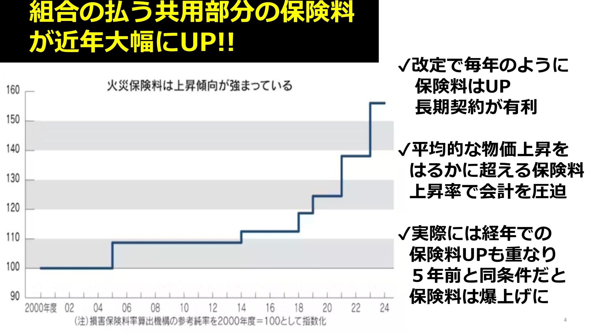 これは組合の保険も自動車の保険同様に、”保険金支払いの多そうな”マンションかどうかで保険料を変えるリスク細分化の流れが進んだためです。