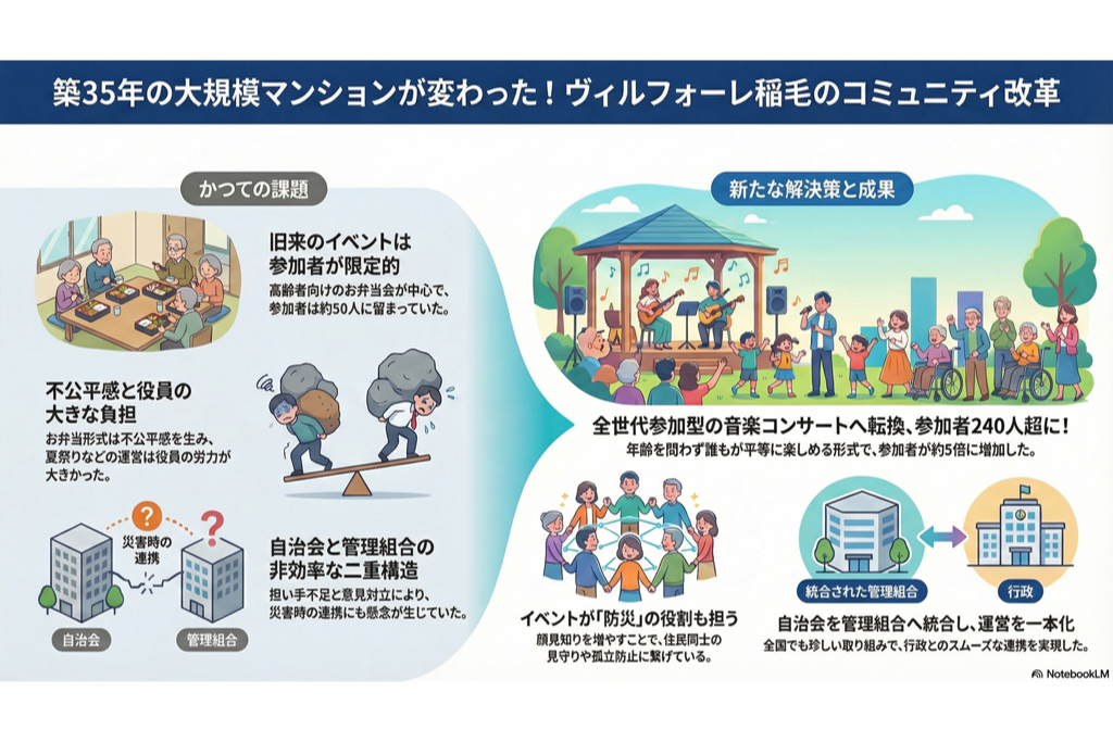 今回取り上げるのは、千葉市稲毛区にある築35年の大規模マンション「ヴィルフォーレ稲毛」。総戸数660戸という規模ながら、理事会の工夫で活気あるコミュニティを築いています。